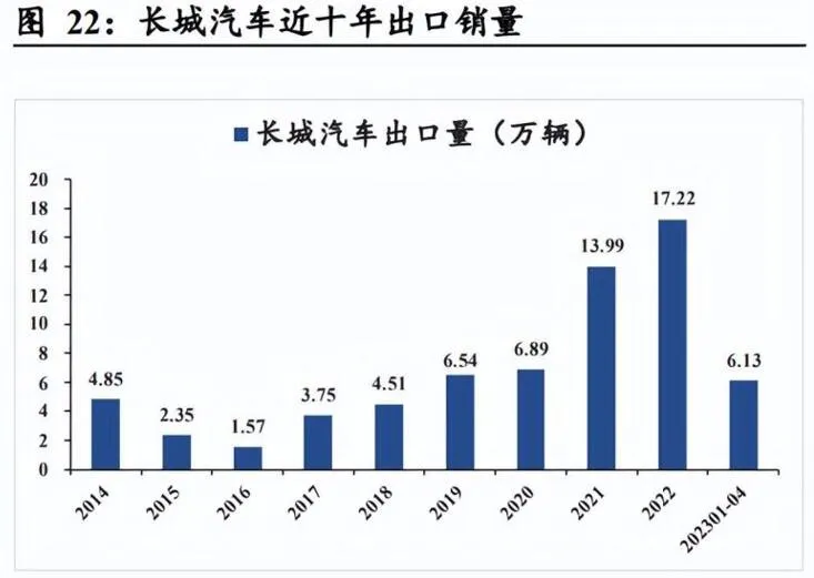Шетелдік нарықтар қарқынды түрде кеңейді және автомобильдердің экспорт көлемі жеті жыл қатарынан өсуді сақтап қалды. Экспорт көлемі 2016 жылы ең төменгі деңгейге жеткендіктен, Great Wall Motors-тың шетелдегі сатылымы соңғы жылдары күшті өсу қарқынымен өсуді жалғастырды. 2021 жылы, ондаған жылдар бойы шетел нарығын орналастырғаннан кейін, Great Wall Motors қытайлық автокөлік экспортының мүмкіндігін сәтті пайдалана алды және оның шетелдегі сатылымы секіріс пен шекпен өсті. 2021 жылы экспорттық сатылым шамамен 140 000 көлікті құрайды, бұл 2020 жылмен салыстырғанда екі есе көп. 2022 жылы - өсу қарқыны 2023 жылы жалғасады.