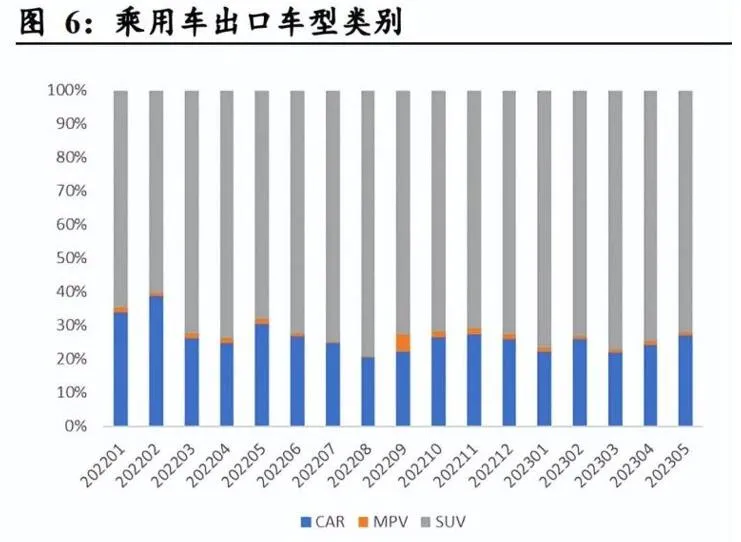 Көлік түрлеріне келетін болсақ, жанармаймен жүретін көліктердің экспортында 70% астам жол талғамайтын модельдер басым. Жаңа энергия экспортының ішінде жол талғамайтын көліктердің седандарға қатынасы 6:4-ке жақын, ал MPV көліктерінің жалпы экспорты көлік түрлеріне қатысты салыстырмалы түрде аз. Жеңіл автомобильдердің экспортында 80% дерлік A0 және A класты шағын автомобильдер басым. Жаңа энергетикалық көліктер арасында B/C класындағы ортадан жоғары деңгейге дейінгі жаңа энергетикалық көліктер салыстырмалы түрде жоғары үлесті құрайды, негізінен Tesla Model 3/Model Y.